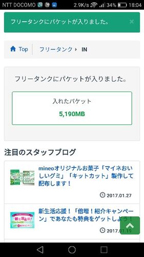 5GBフリータンクに注入しました。 余りすぎるので、基本契約は来月から500MB。 今月分の繰り越しもあるので大丈夫でしょう。