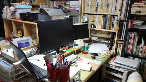 ディスプレイラックに載せたディスプレイ。目線が上過ぎて一日使っていたら頭痛がひどくなり、目線がもっと下にくるようにディスプレイラックを撤去します。キーボードが下に収納できるのは良かったのですが・・・ 正面のディスプレイは「acer S271シリーズ …