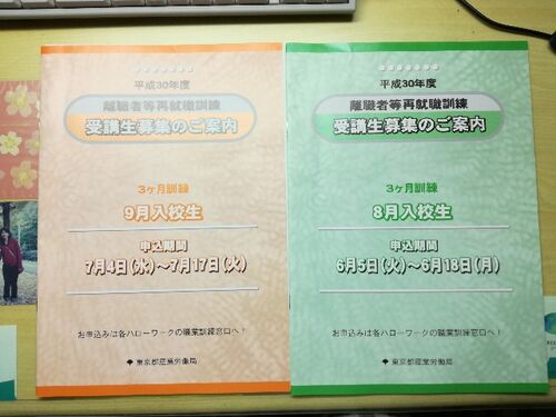 ハローワークから、職業訓練の募集案内書が届いた。左は、先日ハローワークで頂いてきたもの(期限切れ)。右は本日届いた9月入校生用の募集案内。 先日ハローワークに、第一回目の失業認定日に行ったときに就職相談した際、次回の募集要項が来たら、送っても…