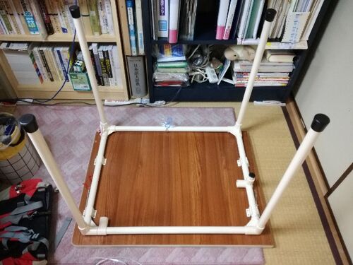 自作のイレクタ机ですが、机の下を有効に使おうと・・・(実際の所は、もう置く場所が無いので、机の下まで使わねばならない状態になっています)・・・カバンを引っかけて収容できるようにしました。 当初は、机の下に網棚的な物置きの棚を増設しようかと思…