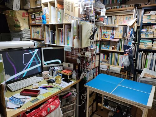 「今週のお題」「デスクまわり」「教えます。わたしのデスクまわり」 机の右側には、豆乳の空き箱で作った本箱が迫り出しています。さらに右手には、新聞の切り抜きや工作用で使う机が。この写真では片付いていますが、だいたいは新聞紙やお菓子の空き箱など…