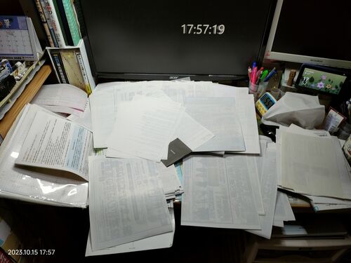 のっけから見苦しい机で申し訳ありません。 今日のお題は、チラシでメモ帳作成。ここに広げているのは、コツコツとためた裏が白いチラシです。A4サイズ以外でペラペラ、広告面が透けて見えるチラシを集めてあります。それ以外の、A4サイズで、プリンタの印刷…