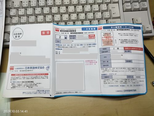 2024年度 第2回 実用英語技能検定 第2級 の受験票です。第1回に続き、今回も受けます。5回目の2級受験です。 今回も勉強らしい勉強を殆どしておらず、模擬試験的な位置づけでの受験になってしまいそうです。 受験会場は、一度行ったことのある学校。最寄り…