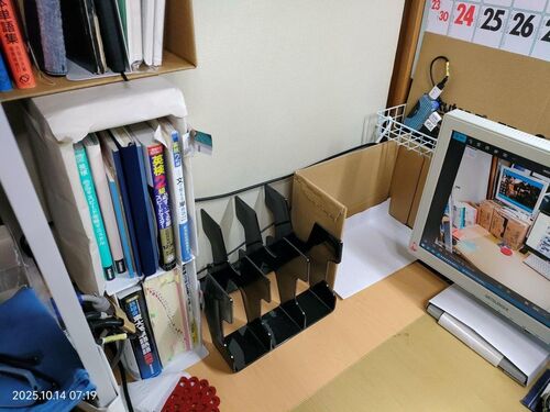 昨晩机上レイアウト変更を始めて、豆乳の空き箱を15インチディスプレイの台にしていましたが、圧迫感があるため撤去。元に戻しました。(カラーボックスは置かず) もう、知らんがな的な話題が続き申し訳ないです。 試しに豆乳の空き箱で作成した本棚を横倒し…