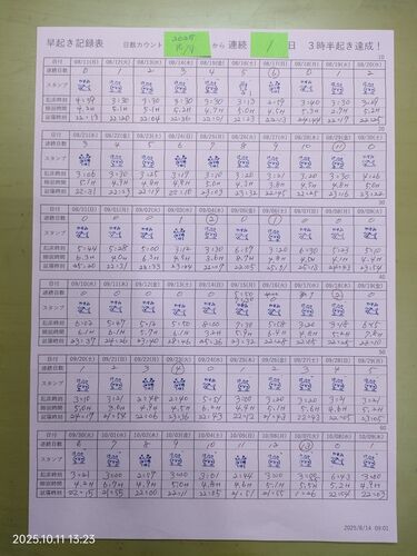 先日紹介した、早起きスタンプカード。続編です。 プリンタインクも補充したので、記録表を印刷。さっそく記入を始めました。 前日の就寝時刻に係わらず、起床時刻は午前3時半に固定。本日は2025年8月14日。3日連続で3時半起床達成!・・・と喜んでいますが…