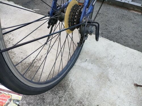 買ったときから気になっていた、前ブレーキの「鳴き」(キーキー音)。と、ブレーキシューがリムに当たる音がたまに鳴る(シュルシュルいう音) 購入したカインズのお店で調整してもらう。前後ともVブレーキ。 後輪はブレーキをかけても音がしないが、前輪だけ鳴…