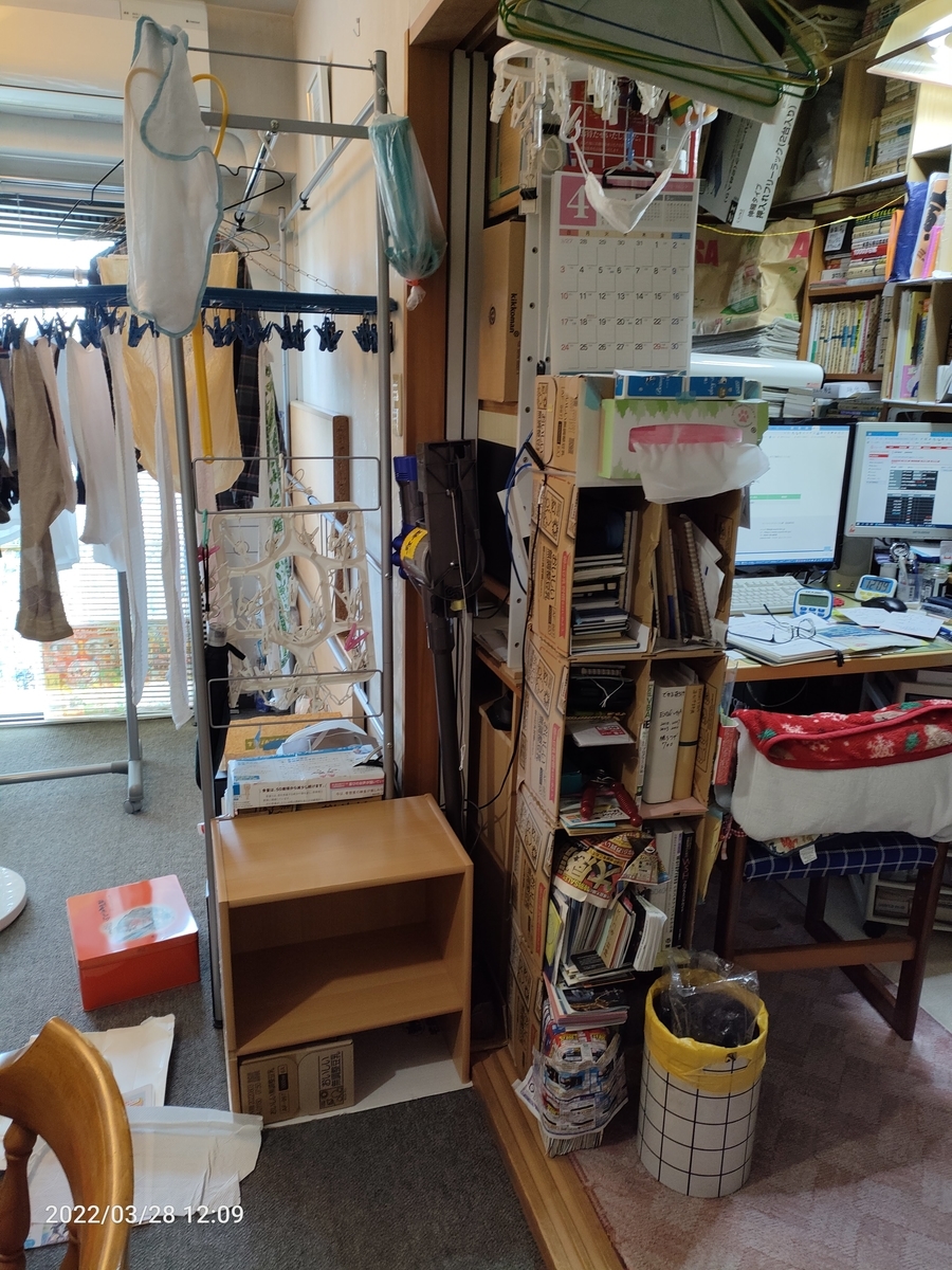 まず、この写真。半分に切断したカラーボックスの上にA4サイズのレターラック(書類ケース)を収納した棚。そしてその上に切り開いた豆乳のパック(リサイクル用にまとめています) だらしなさ全開。