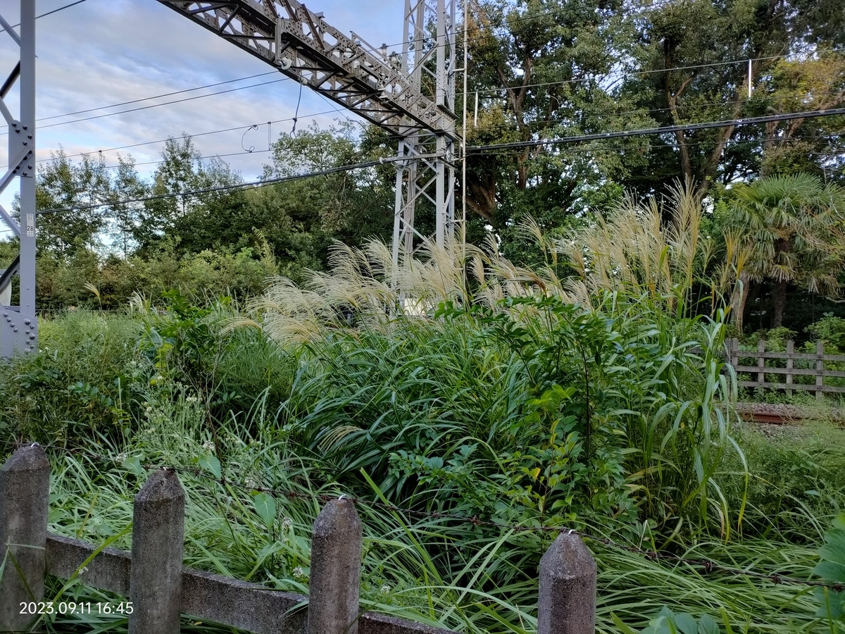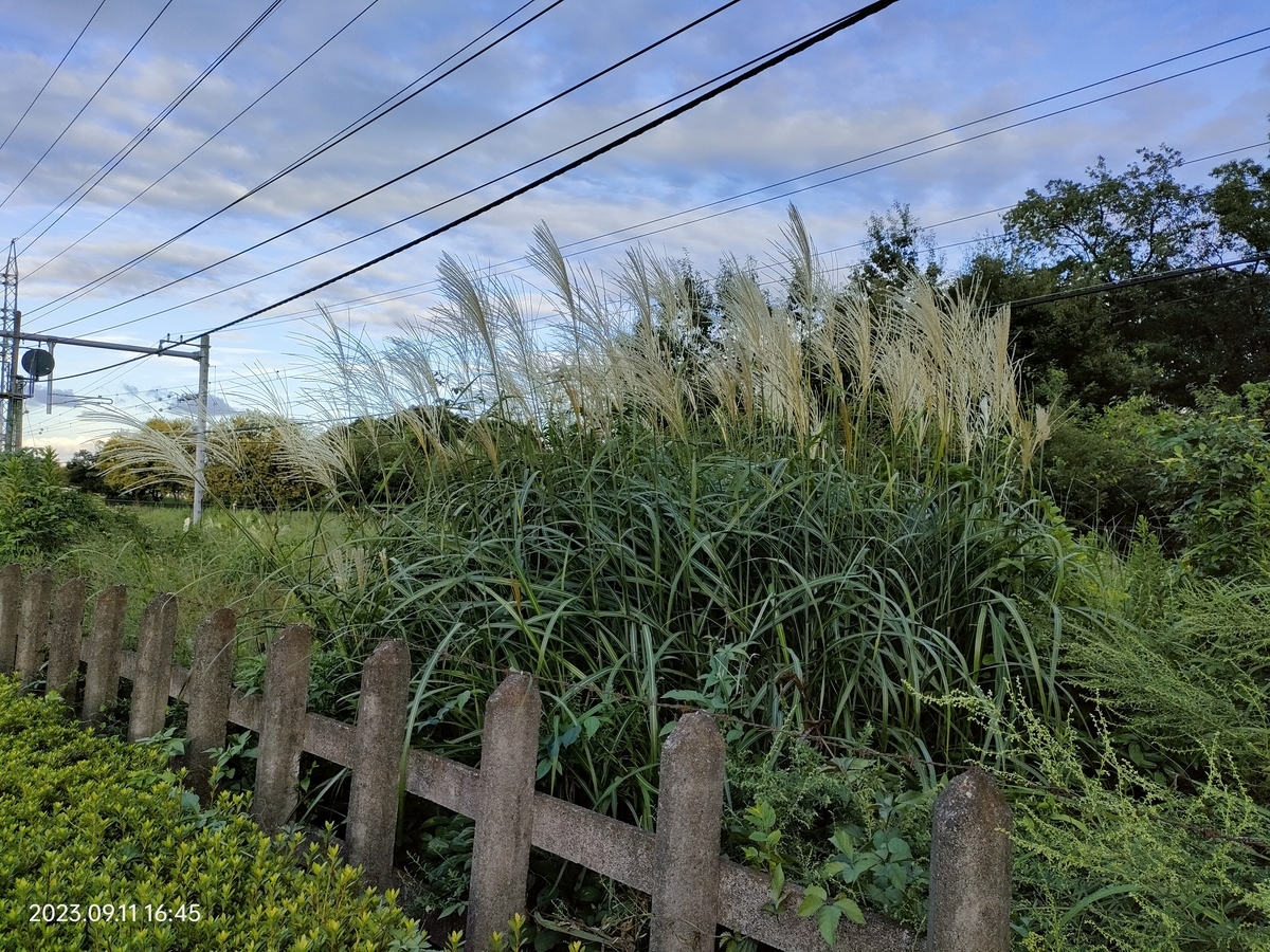 曇っているので、いつもより気持ち早めに散歩を開始。いつもの公園外周の遊歩道。右手にススキを発見。右手向こうには遅咲きのひまわり。