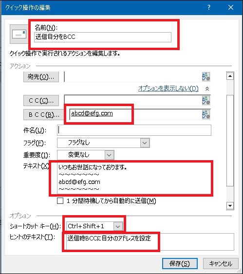 前回はBCCに自分のアドレスを入力しましたが、今回はそれに加えて、クイック操作の名前と、メール本文に事前に出力しておきたいテキストを入力してみます。