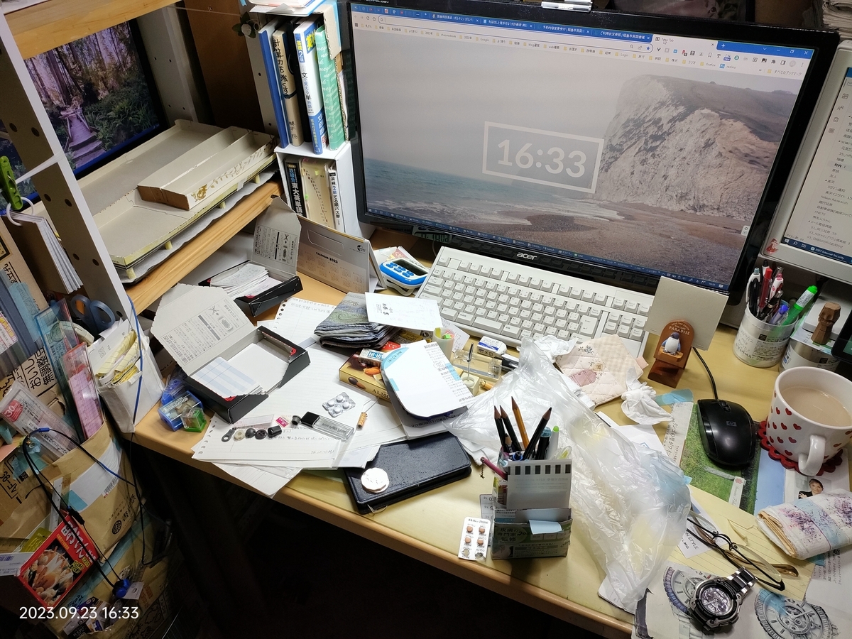 机の左側に書類がたまってきました。書類と呼べるほどのものではありませんが、ルーズリーフから取り外したメモ、書き終わって、これから綴じるもの。またレシートやらその他の紙類が積み上がってきました。片づけないといけません。