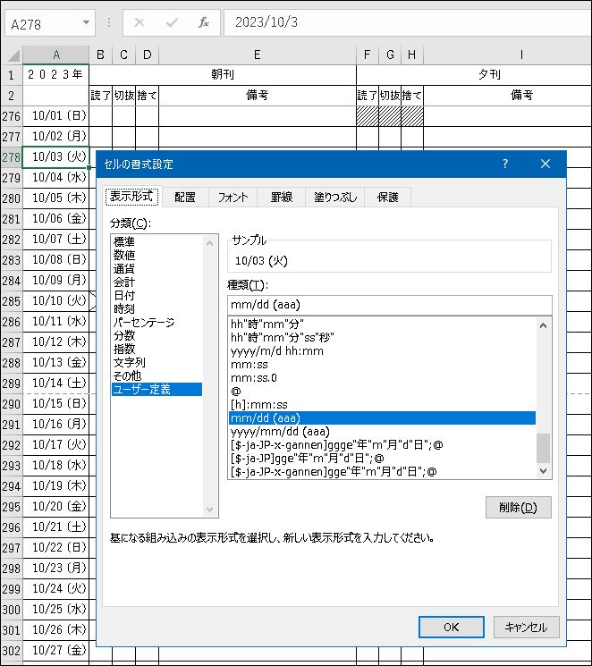 日付と曜日が一緒に表示されていますが、これは、セルの書式設定の表示形式で、「ユーザー定義」として、「種類」の欄に「mm/dd(aaa)」と指定しています。「月2桁/日2桁(曜日を1桁日本語で)」