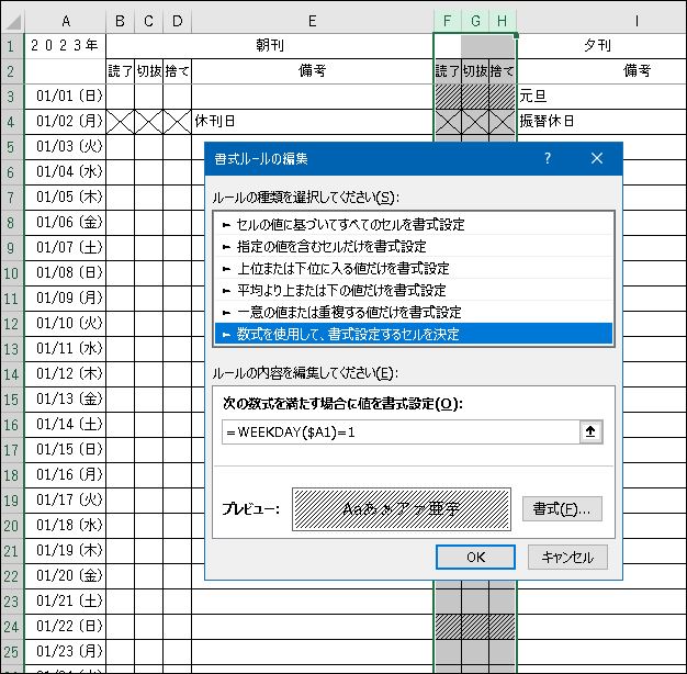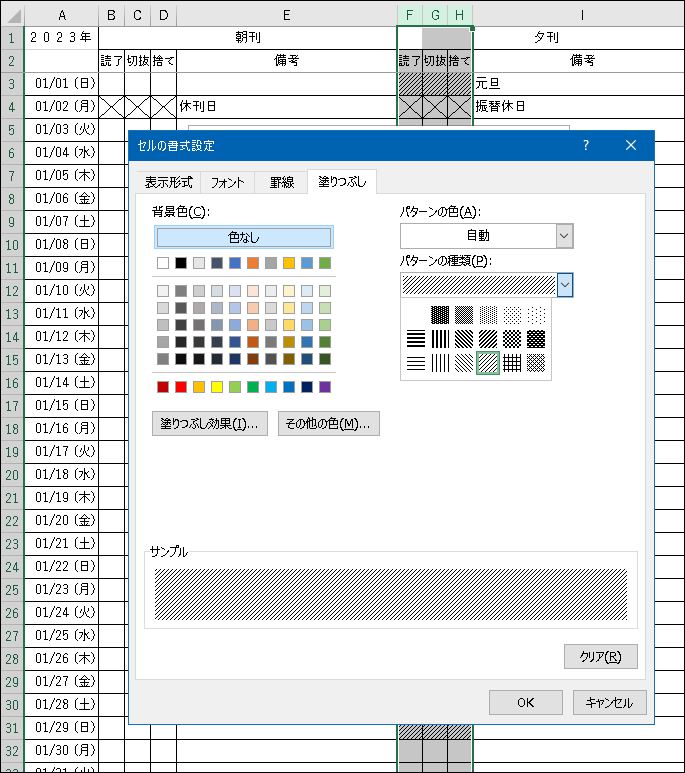 次に条件付き書式設定を使って、夕刊の日曜日の欄に斜線を入れています。