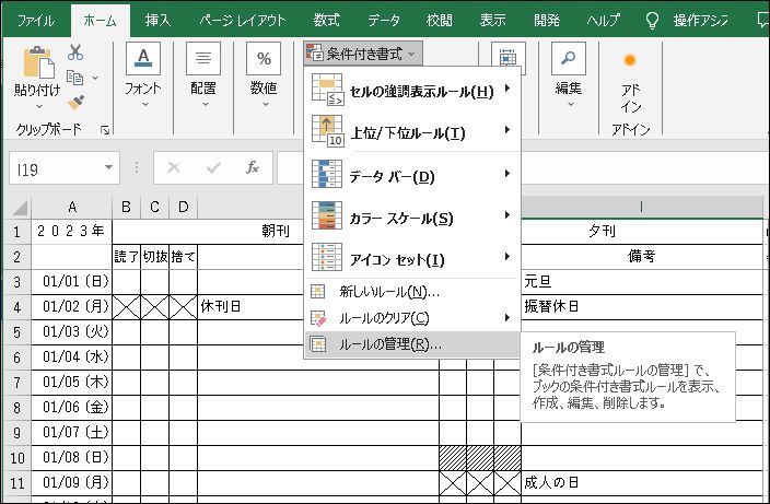 ホームタブ > 条件付き書式設定 > ルールの管理