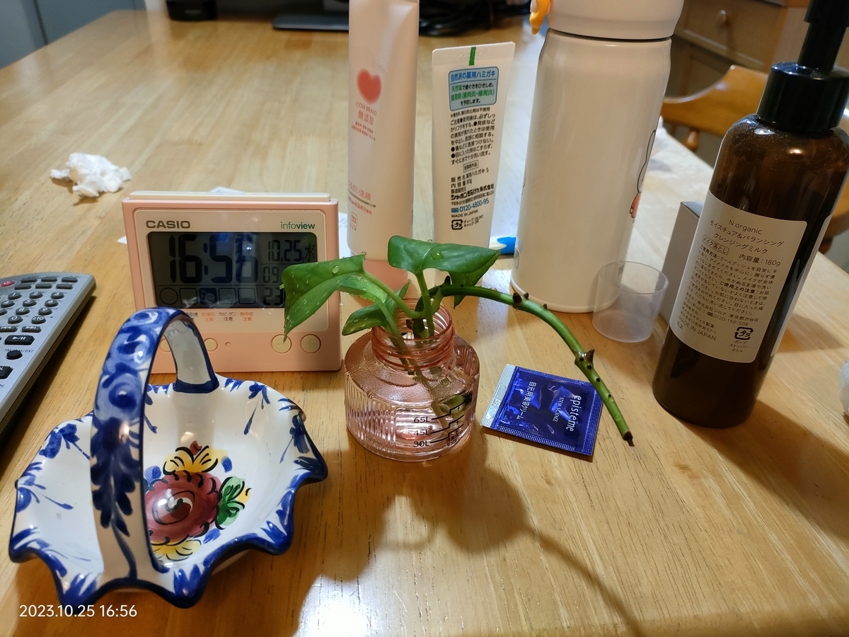 以前、2Lのペットボトルを横倒しにして側面を切り取ったものに水を張り、そこでポトスを育てていたこともありました。ドンドン増殖して、手に終えなくなり、いつだったか処分してしましました。これもそこまで大きく伸びてくるかな。