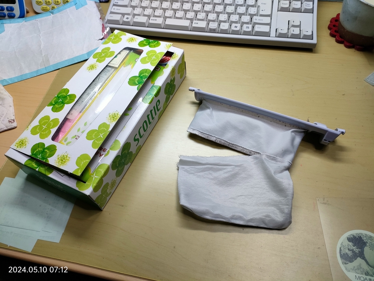 シャープ製。縦型洗濯機の糸くずフィルタです。まん中の縫い目が解けて、提灯お化みたいになってしまいました。フィルタの布自体は、まだまだ使えるので補修します。