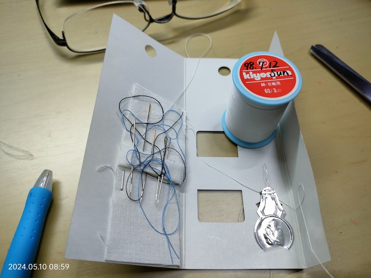 使った糸はコレ。1998年7月12日(日)に使い始め。26年経過していますが、全然減っていません。糸通しは必需品です。これが無いと針に糸を通せません。