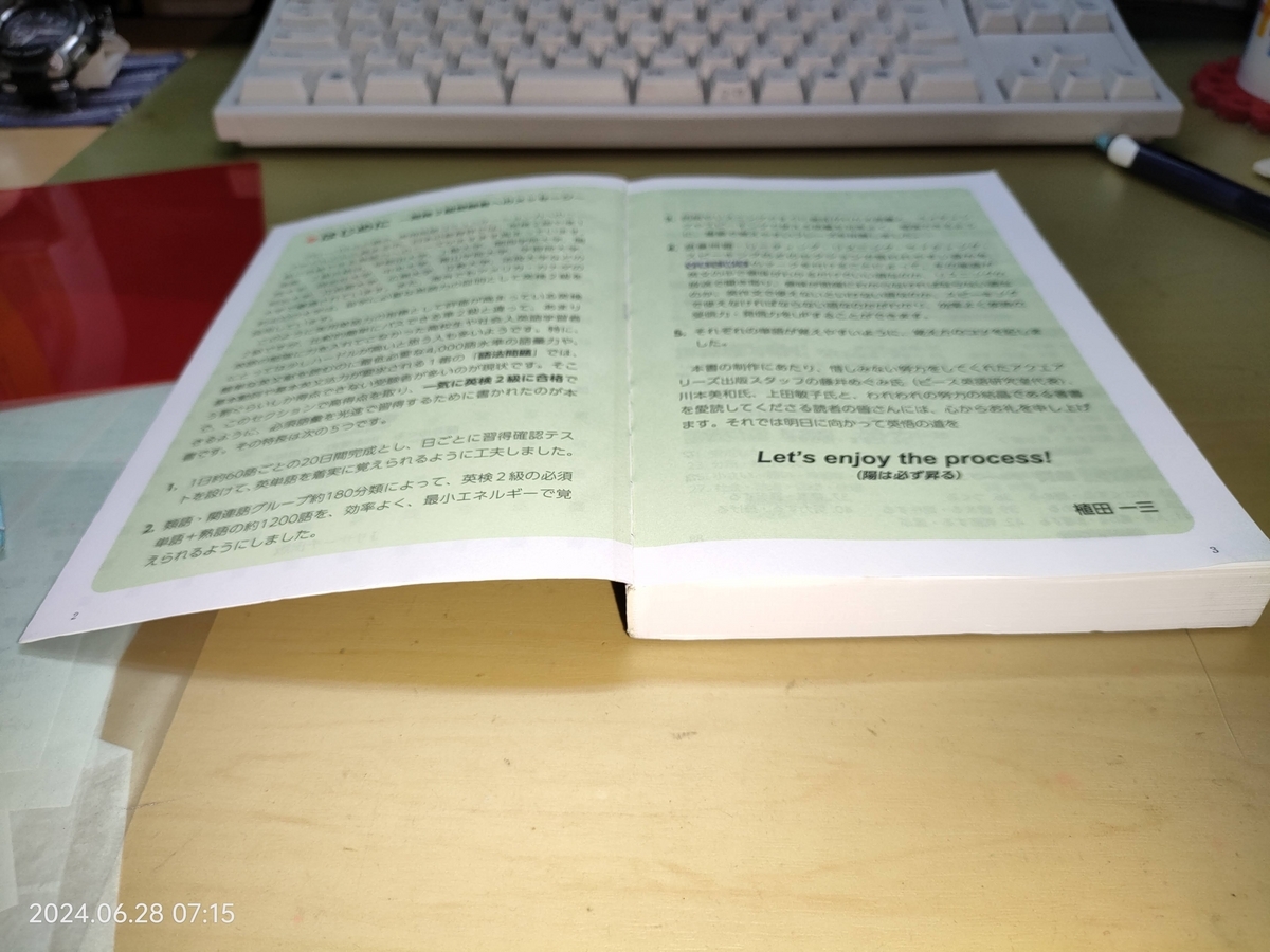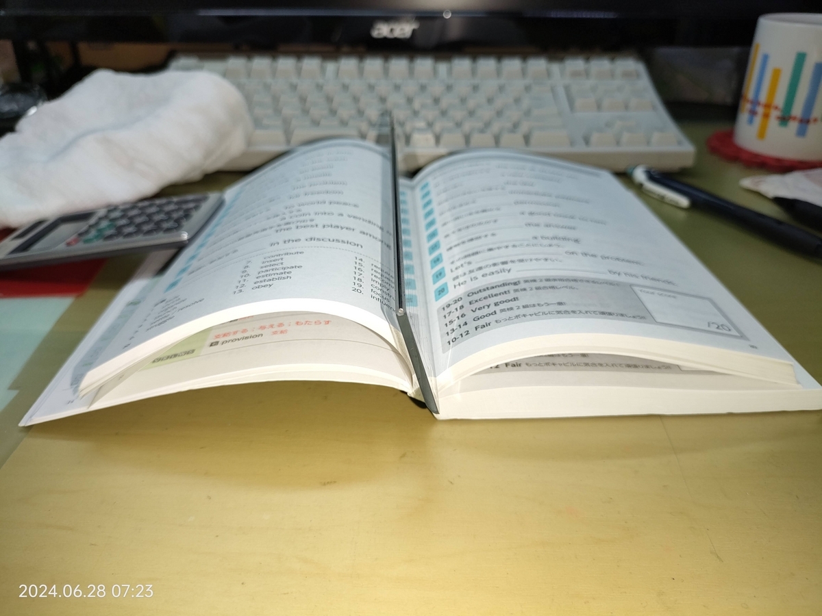 新しく買った単語帳。そのままでは手で押さえていないとページが閉じてしまうので大変不便。なので、開いた状態でパタンと180度近くまで開いた状態にしたいので、折り癖を付けていきます。