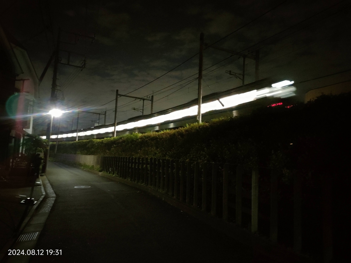 暗くて写真も撮れないと思っていたら、ちょうど電車がやってきたので撮影。光の帯が撮れました。