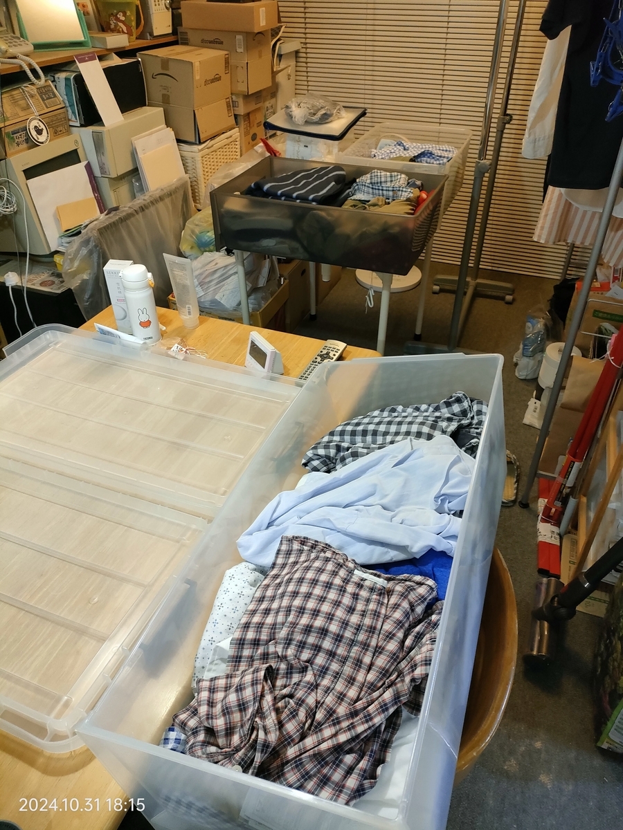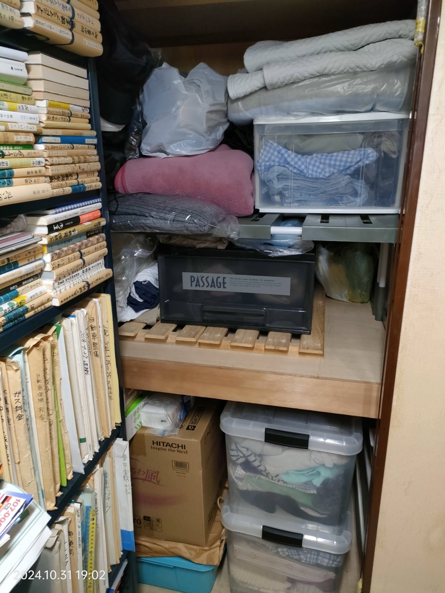 毎度のことですが、冬物が格納してある衣装ケースにアクセスするため、手前の作業机を移動せねばなりません。お見苦しい状況で、申し訳ありません。では、やっていきます。