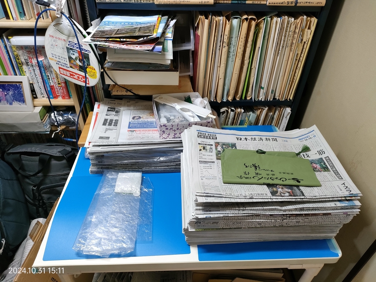 先ず、新聞を何とかします。机上に積み上がっているのが未処理の新聞。机の下にあるのは、一次処理を終えた新聞。朝刊ばかりです。夕刊は未処理のまま。