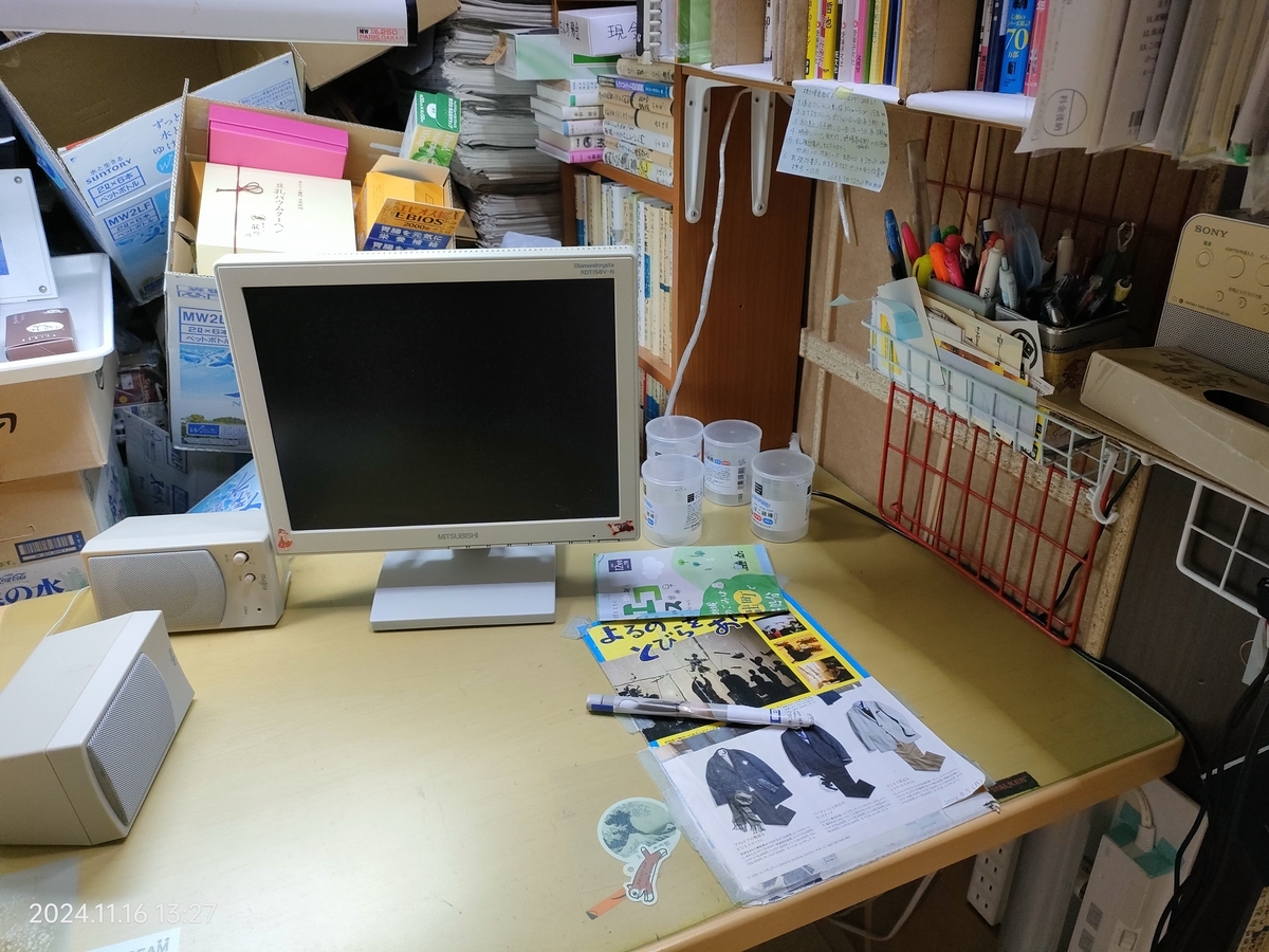 机の下にもカラーボックスがあり、このままでは重く移動できないので、一旦本を取り出します。下段の大きめ黄色い紙袋はカセットテープ。その隣は、富士通製ノートPC「FMR50NL」、パナソニック レッツノート。
