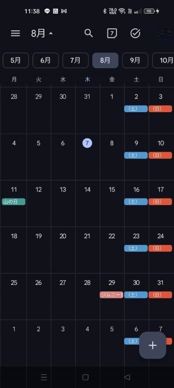グーグルカレンダー。何の設定もせずに使っておりましたので、このとおり。たまに忘れてはいけない対外的な予定のリマインドとして使うだけでしたので、土日祝日に印が付いていなくても、特に困りませんでした。紙の手帳で管理しているし。